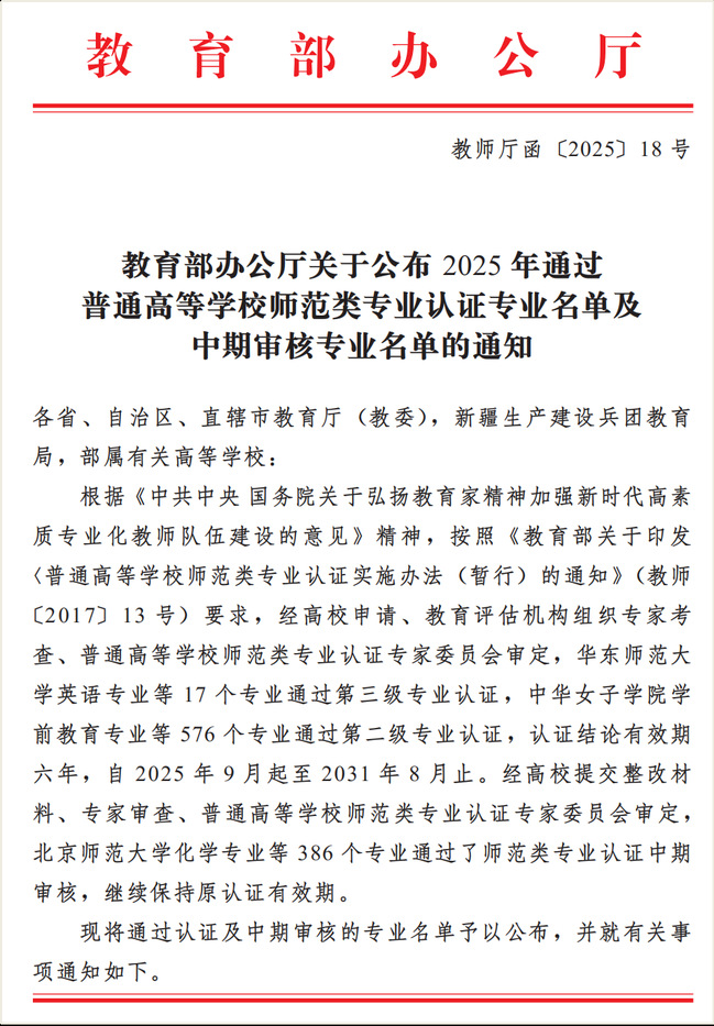 近日,教育部办公厅下发了《关于公布2025年通过普通高等学校师范类专业认证专业名单及中期审核专业名单的通知》(教师厅函〔2025〕18号),我院物理学专业通过认证。