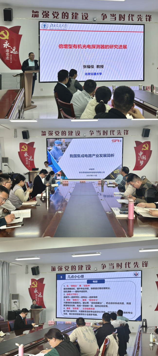 张福俊以“倍增型有机光电探测器的近期研究”为题,围绕倍增型光电探测器这一原创性成果的探索过程展开,重点讲解了如何面对困难、破解科研难题的逻辑思路。卓祖亮以“我国集成电路装备产业发展简析”为题,围绕我国破局“卡脖子”产业的布局展开,指出尽管过程艰难但产业链人才需求量十分庞大的现状。孙倩倩以“三元有机光伏器件的研究”为题,围绕这一新兴技术的基本原理等展开,重点介绍如何发现问题、研究问题和解决问题的思路。专家团队与师生就光电探测、集成电路人才需求、有机光伏器件和研究生招生等展开热烈探讨,主讲人逐一细致解答,现场学术氛围浓厚。