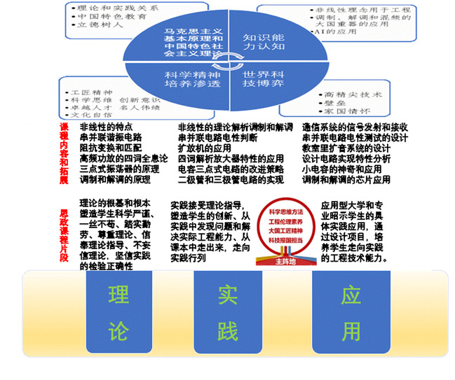 5、课程思政润物细无声。课程思政以“全员全程全课程” 育人格局为核心,与思政课同向同行,落实立德树人根本任务。通过融入大国重器、前沿技术等内容,培养学生爱国精神、民族自豪感及科学/工匠 / 奋斗精神,传递“知识改变命运”理念,激发学习自觉。课程内容改革聚焦三大亮点:采用线上线下混合式教学;依托知识图谱实现内容模块化、闭环化、浸润化、拓扑化;按电路功能模块化组织教学;将课本理论转化为实践应用类课题设计。