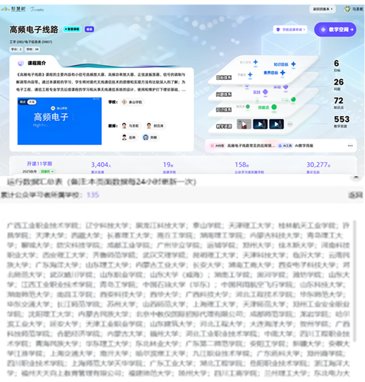 3、知名高校和社会学习者关注度提升课程建设。以线上课程为载体,从加入到智慧树平台和国家高等教育智慧平台,目前应用的学校和人数创了新高,不乏有上海交通大学、同济大学、中南大学、山东大学等158所选择了高频电子线路线上课程。选课人数达到了3400余人,社会学习者的关注度也在提升,人数达到了476人。