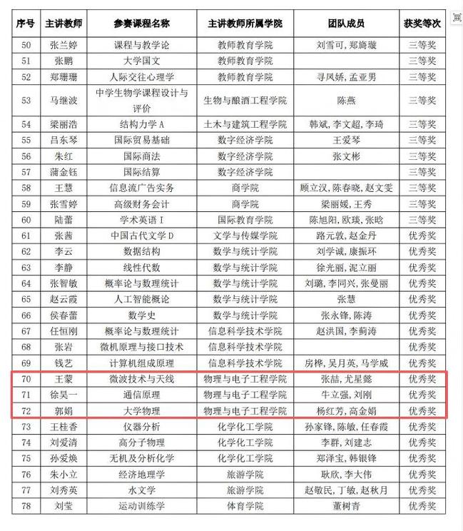 其中,宋倩倩老师主讲的《信号与系统》课程(团队成员朱梅)荣获一等奖;王蒙老师主讲的《微波技术与天线》(团队成员张喆、尤星懿)、徐昊一老师主讲的《通信原理》(团队成员牛立强、刘刚)、郭娟老师主讲的《大学物理》(团队成员杨红芳、高金娟),均荣获优秀奖。