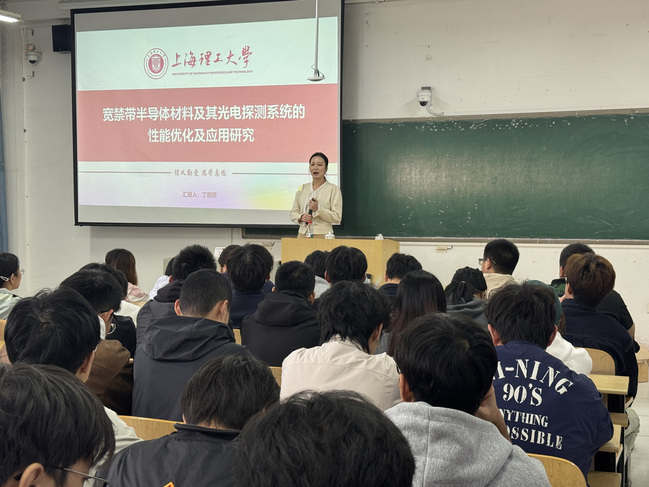 讲座中,丁思同以《宽禁带半导体材料及其光电探测系统的性能优化及应用研究》为题,从宽禁带半导体领域的核心方向切入,结合自身团队科研经历和行业实际需求,清晰梳理该领域技术发展逻辑与应用前景。讲解过程中,丁思同围绕学科建设、科研合作等话题与师生探讨交流,讲解过程节奏清晰、重点突出,充分展现出深厚的学术功底。