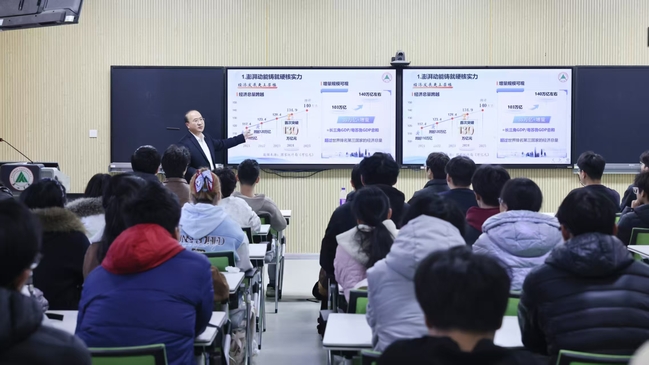 2025年11月19日,党委委员、副校长魏新江走进一号综合楼A4009智慧教室,以“决胜‘十四五’,奋发向前行”为主题,为物理与电子工程学院学生讲授了一堂立意深远、内容充实的形势与政策课。